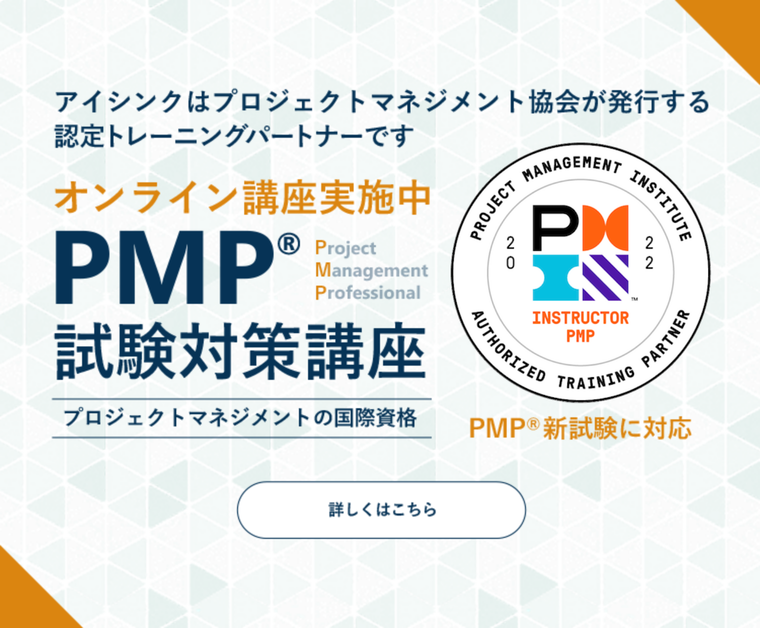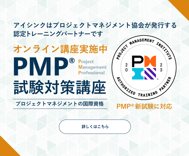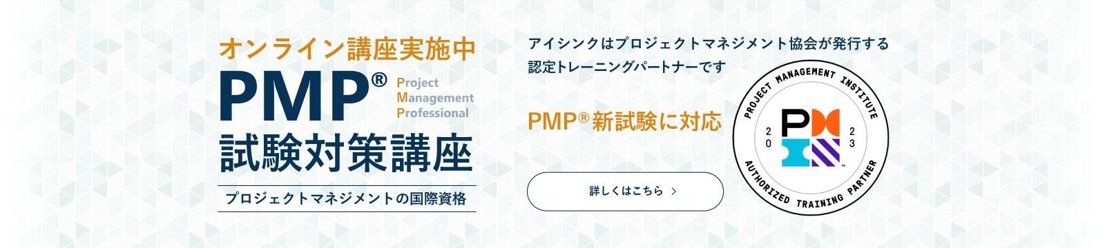 アイシンク株式会社は、米国プロジェクトマネジメント協会(PMI®)の公認教育プロパイダー(R.E.P.)に指定されています。提供する講座はすべてPMP®(プロジェクトマネジメントの国際資格)維持のための単位であるPDUの対象講座です。