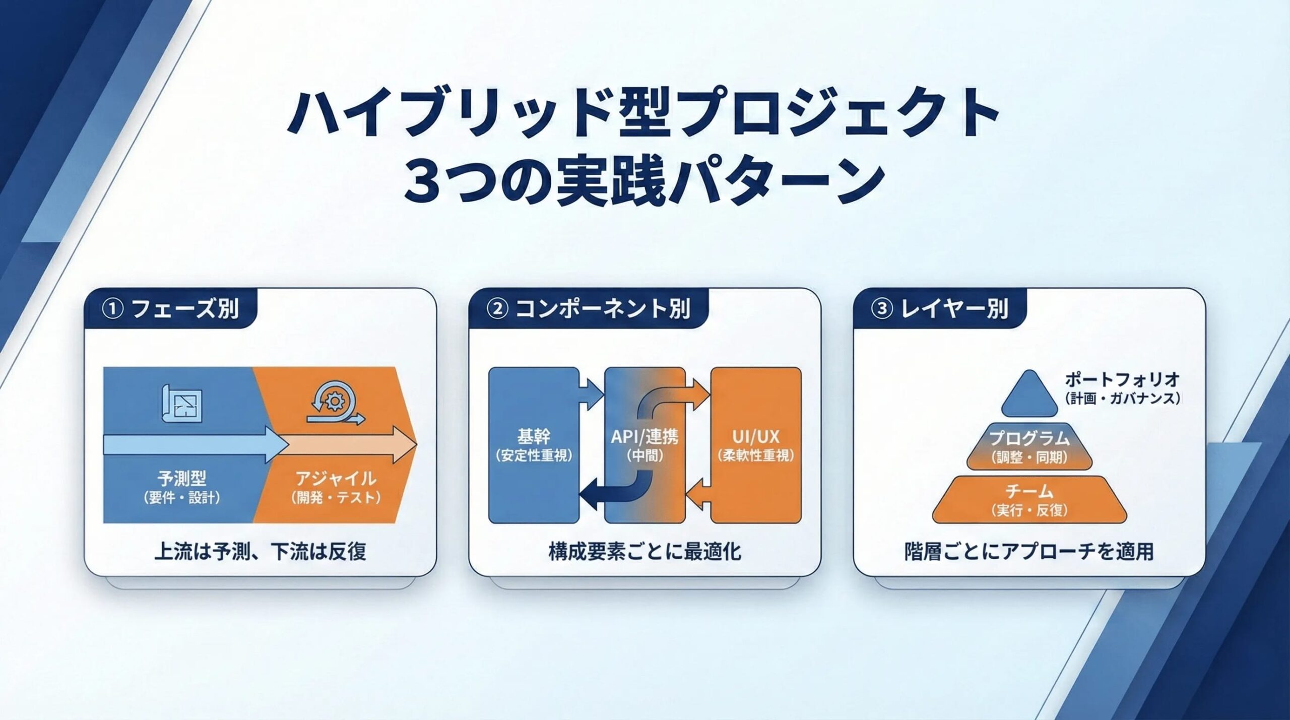 ハイブリッドアプローチの習得:予測型とアジャイル型は二項対立ではなく、プロジェクト特性に応じて柔軟に組み合わせることが重要です。フェーズ別、コンポーネント別、レイヤー別の3つのパターンを状況に応じて適用しましょう。