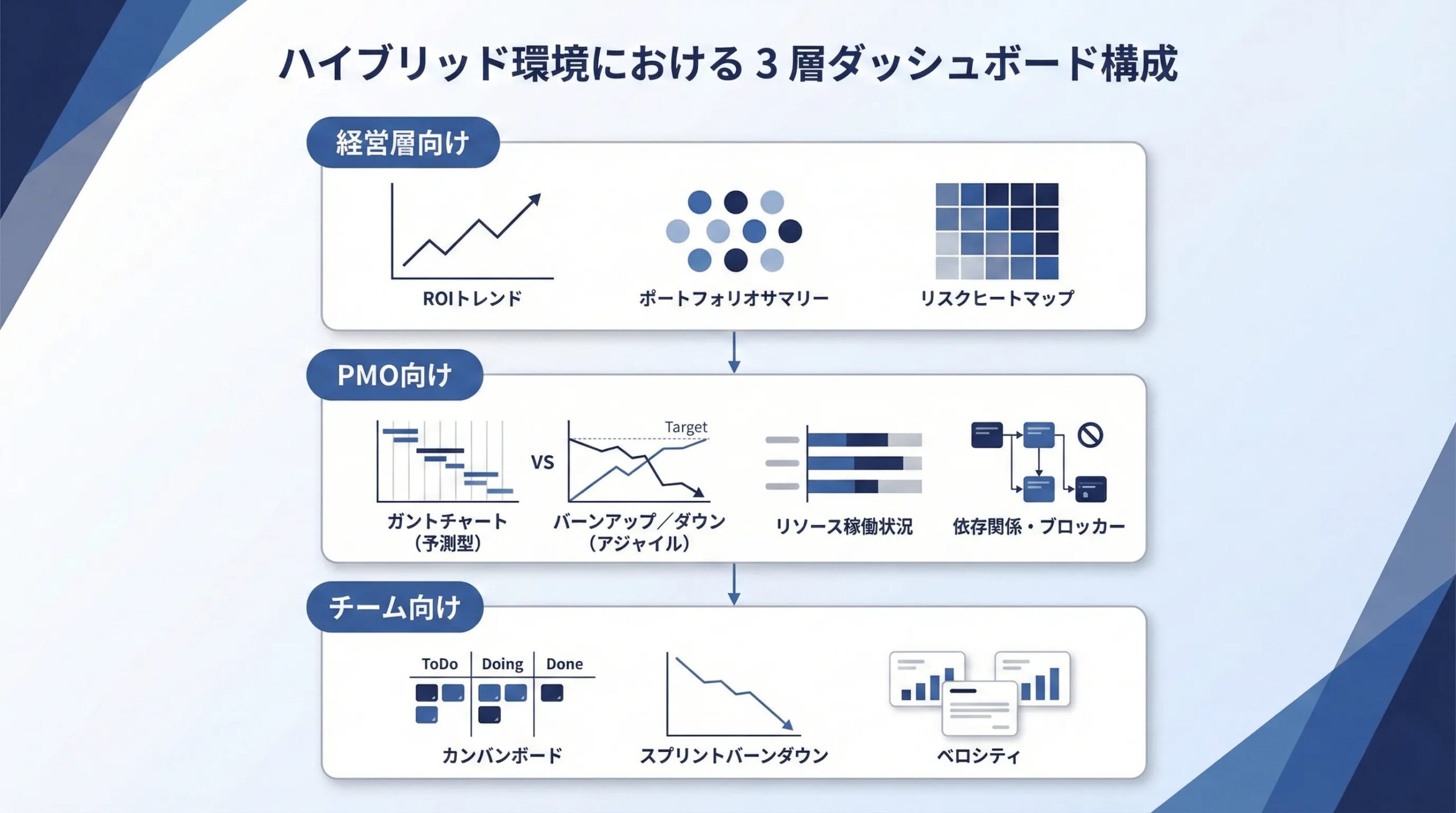 ハイブリッド環境では、予測型プロジェクトとアジャイルプロジェクトが混在するため、それぞれの特性に応じた可視化手法を組み合わせたダッシュボード設計が必要です。